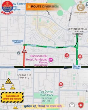 फरीदाबाद में यातायात व्यवस्था को सुचारू बनाए रखने के लिए FARIDABAD TRAFFIC POLICE -TRAFFIC ADVISORY जारी की गई है। इसके तहत बाटा रेलवे फ्लाईओवर (ROB) पर मरम्मत कार्य 04/04/2026 से शुरू कर दिया गया है। यह कार्य अगले कुछ दिनों तक जारी रहेगा, जब तक कि पूरा काम समाप्त नहीं हो जाता।