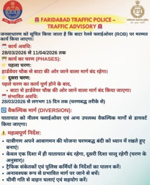 फरीदाबाद में बाटा रेलवे फ्लाईओवर (ROB) पर मरम्मत कार्य के चलते यातायात व्यवस्था में अस्थायी बदलाव किया गया है। फरीदाबाद ट्रैफिक पुलिस ने इस संबंध में विस्तृत Traffic Advisory जारी करते हुए आम नागरिकों से सहयोग की अपील की है। यह कार्य 28 मार्च 2026 से शुरू होकर 11 अप्रैल 2026 तक चरणबद्ध तरीके से चलेगा।