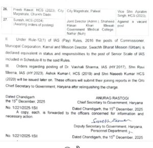 चंडीगढ़। हरियाणा सरकार ने राज्य के administrative structure में बड़ा बदलाव करते हुए एक साथ large scale पर IAS और HCS अधिकारियों के transfer और posting किए हैं। इस order में कुल 27 officers (6 IAS और 21 HCS) के नाम शामिल हैं।