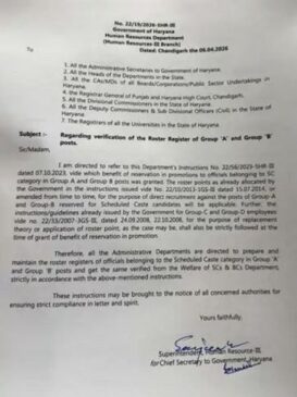 हरियाणा सरकार ने अनुसूचित जातियों के लिए आरक्षण व्यवस्था को अधिक प्रभावी और पारदर्शी बनाने के उद्देश्य से नई पहल शुरू की है। सरकार ने सभी सरकारी विभागों, बोर्डों और निगमों को निर्देश जारी कर कहा है कि वे अपने यहां ग्रुप ‘ए’ और ‘बी’ पदों के लिए Roster Register तैयार करें, उसे नियमित रूप से अपडेट रखें और उसका सत्यापन भी सुनिश्चित करें।